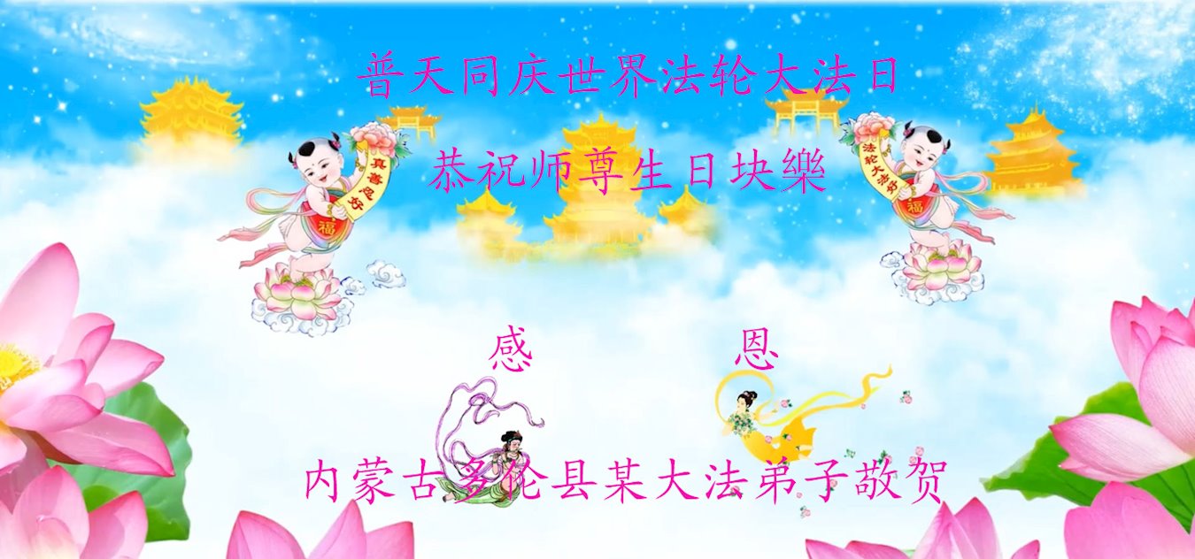 恭祝慈悲伟大的师尊生日快乐!恭贺世界法轮大法日! 我是一名正法时期的大法弟子,千万年、亿万年的等待,终于走上了返本归真的修炼路,二十多年的修炼,每走一步都离不开师尊的加持与保护!师父用巨大的承受为弟子和众生付出了所有,每当拿起宝书《转法轮》时,心中喜悦之情难以言表,大法弟子按照法的标准时时修心性,做好三件事,多救人,兑现自己的史前誓约。 内蒙古自治区锡林郭勒盟多伦县大法弟子恭祝慈悲伟大的师尊生日快乐!