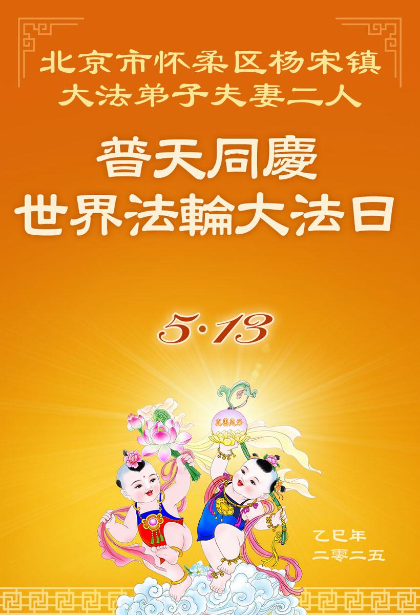 北京市怀柔区杨宋镇大法弟子夫妻二人普天同庆世界法轮大法日!