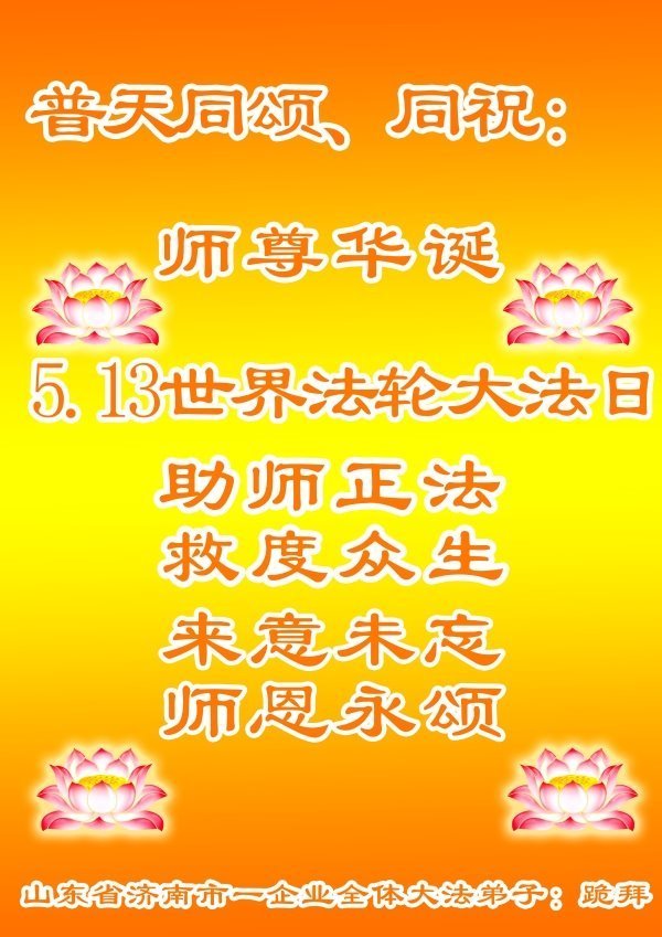 感恩师尊慈悲救度! 弟子要精進实修,不辱使命,跟师尊回家。 山东省济南市一企业全体大法弟子恭贺法轮大法日!