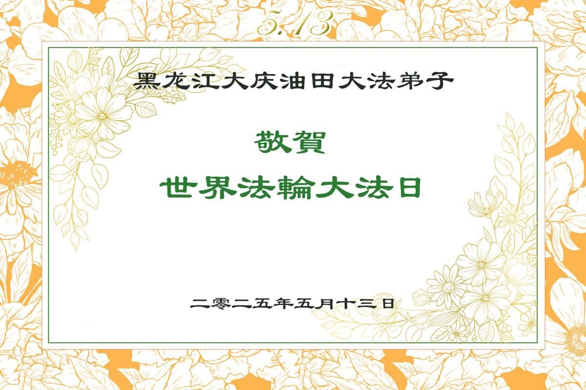 中国大陆公务员系统大法弟子 二零二五年五月九日 黑龙江大庆油田大法弟子恭祝师尊生日快乐!恭贺法轮大法洪传33周年!恭贺世界法轮大法日!