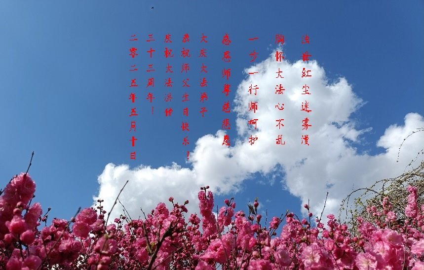浊世红尘迷雾漫 胸怀大法心不乱 一步一行师保护 感恩师尊慈悲愿 大庆大法弟子恭祝师父生日快乐!庆祝大法洪传三十三周年! 二零二五年五月十日 黑龙江大庆一学法小组大法弟子恭贺世界法轮大法日暨师尊生日快乐!