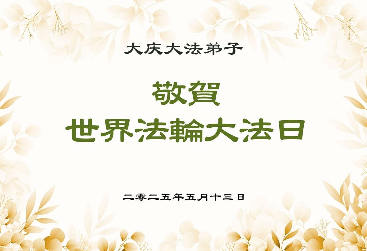 黑龙江大庆第九采油大法弟子 二零二五年五月九日 黑龙江大庆盐湖城一学法小组大法弟子恭贺世界法轮大法日暨师尊生日快乐!