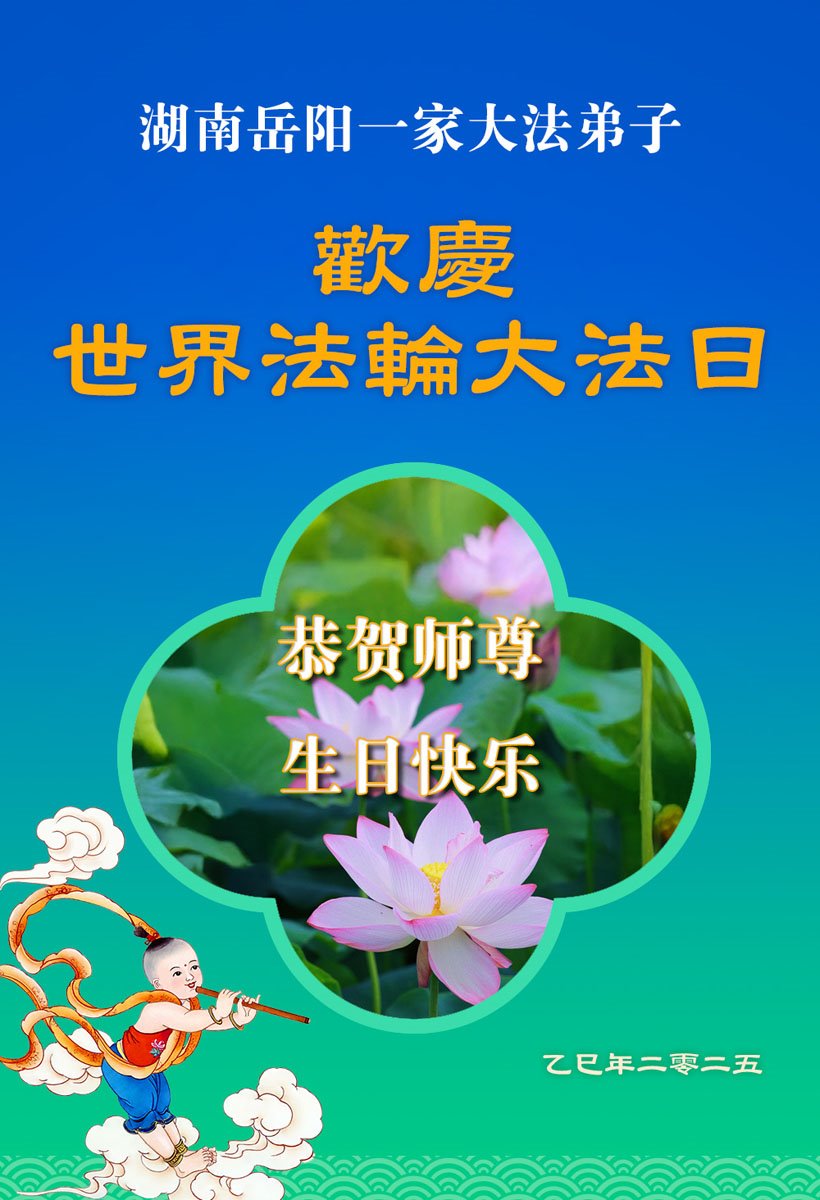 普天同庆5.13世界法轮大法日,恭贺师尊华诞!感恩您的巨大承受付出,感恩您的慈悲救度,无论风和日丽,还是暴风骤雨,始终得到大法的启悟、爱护、造就,真的无比感恩!我们一定做好“三件事”,精進实修,做合格的正法修炼者。 湖南衡阳大法弟子敬上 2025年5月7日 湖南省郴州市全家大法弟子恭祝世界法轮大法日!恭祝师父生日快乐!