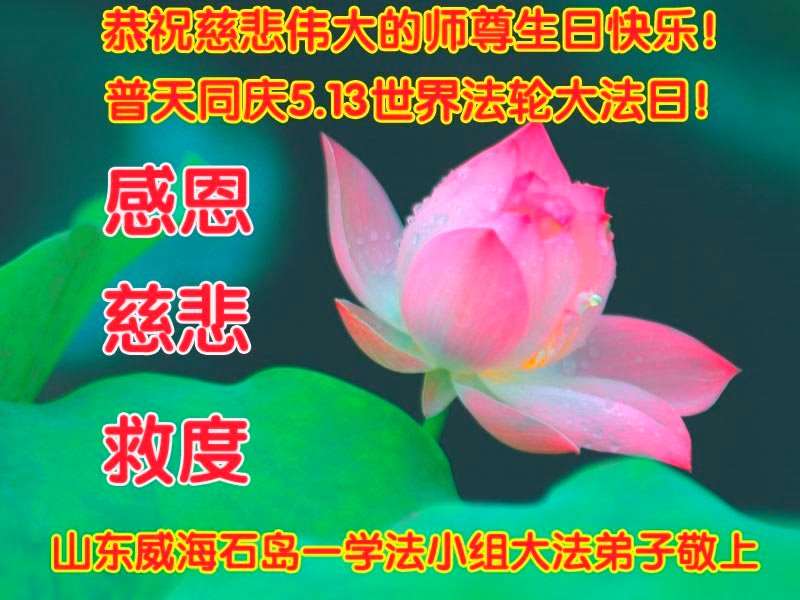 山东威海石岛一学法小组的大法弟子庆祝5.13世界法轮大法日!恭祝慈悲伟大的师尊生日快乐!