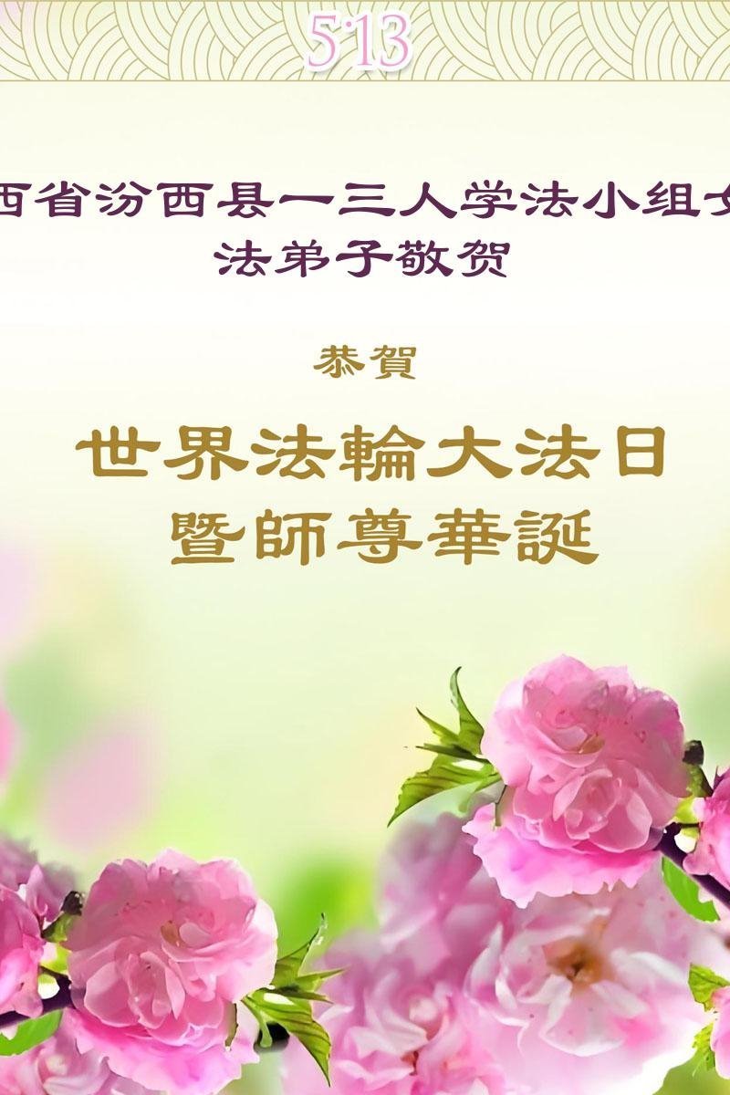 恭祝师尊华诞!恭贺513世界法轮大法日! 感谢师父的慈悲苦度!弟子一定牢记使命,兑现誓约,跟师父圆满回家! 山西省汾西县一三人学法小组女大法弟子敬上 山西省曲沃县大法弟子恭贺513世界法轮大法日暨师尊华诞!