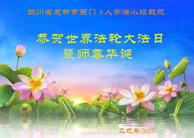 恭贺世界法轮大法日! 四川省成都市西门九人学法小组大法弟子恭贺世界法轮大法日暨师尊华诞!