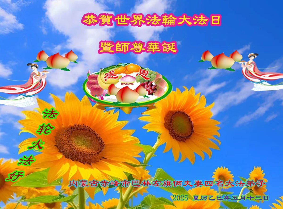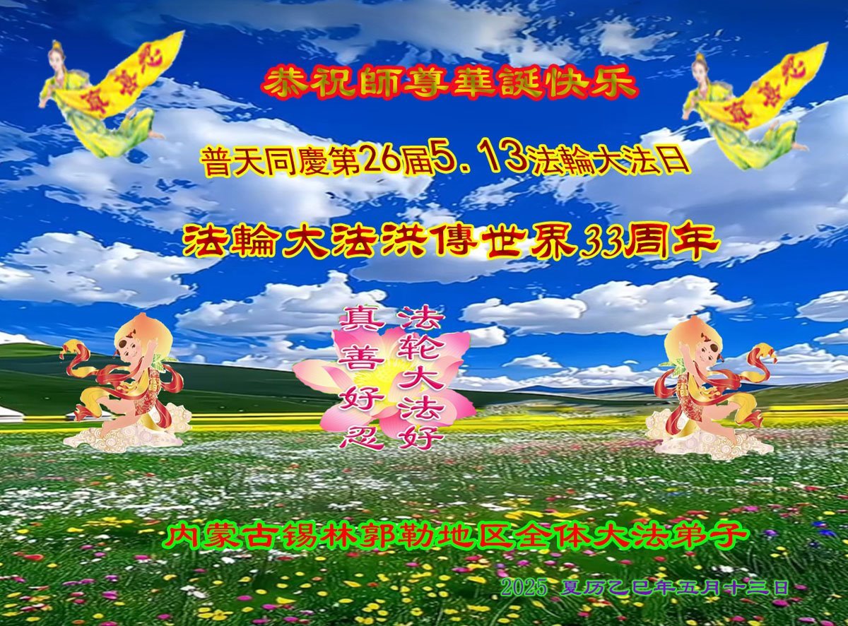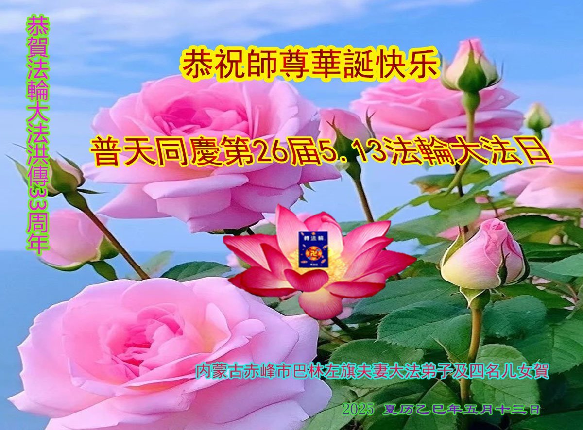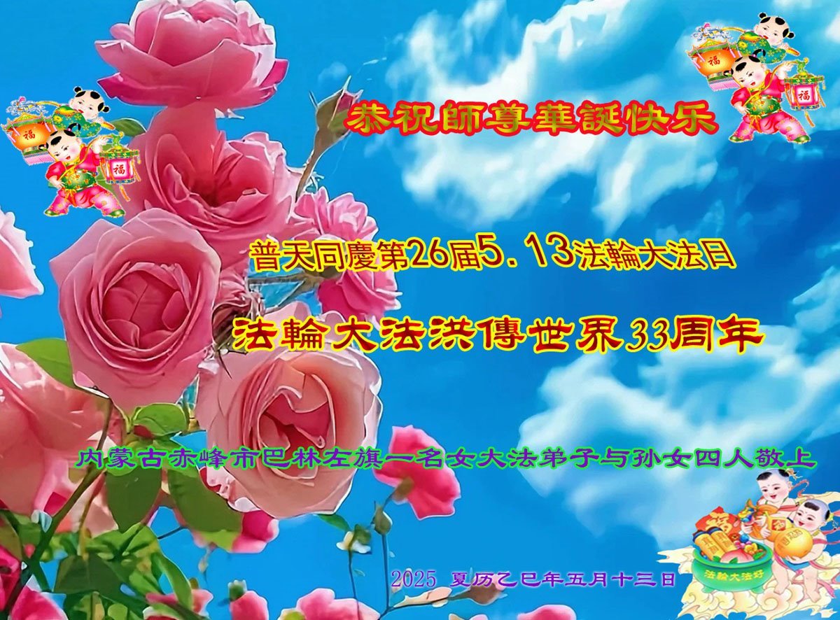 恭贺5.13世界法轮大法日!恭祝慈悲伟大的恩师生日快乐! 内蒙古巴林左旗一大法弟子和三个大法小弟子敬上 二零二五年五月十日 |