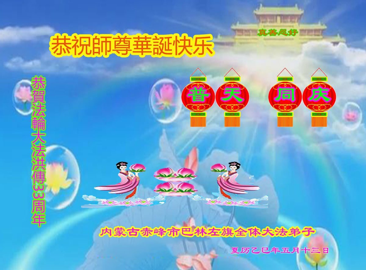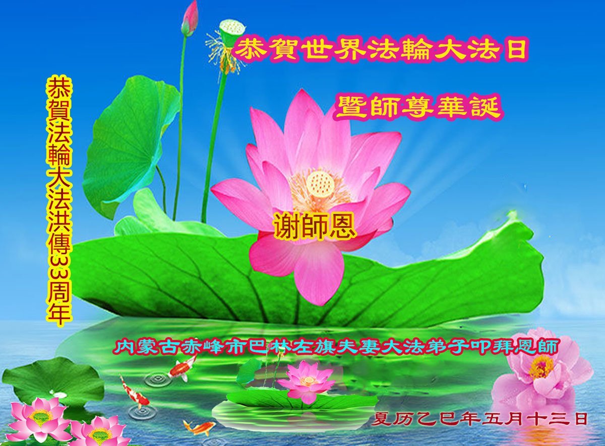恭祝师父生日快乐!恭贺世界法轮大法日!感恩师父慈悲救度。 内蒙古赤峰市四名大法弟子敬上 内蒙古赤峰市松山区母女大法弟子恭贺法轮大法洪传33周年!恭贺世界法轮大法日!