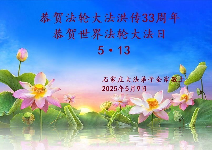 恭贺世界法轮大法日!恭祝慈悲伟大的师尊生日快乐!谢谢师尊慈悲苦度。 吉林省长春大法弟子和大法小弟子及家人敬上 二零二五年五月十一日 |