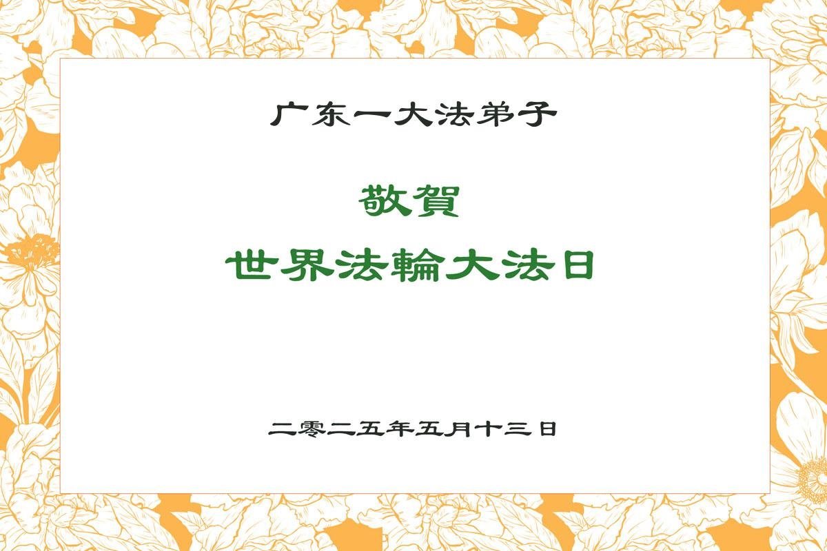 敬贺世界法轮大法日!恭祝慈悲伟大的师父生日快乐! 普天同庆同颂谢师恩!感恩师父为弟子承受了那么多,消去无数的罪业,看护着、保护者弟子从魔难中走过来。用尽所有的语言也表达不了感恩师父的慈悲苦度!唯有做到真修、实修,按照真、善、忍的标准,修好自己,做好三件事,完成大法弟子的使命,才能功成圆满,回报师恩!弟子叩拜谢师恩! 广东省梅州市大法弟子敬上 二零二五年五月十日 广东省珠海市大法弟子敬贺世界法轮大法日!