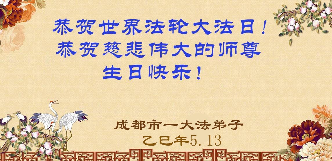 法轮大法好,真善忍好。 叩拜师尊!师父辛苦了!我们想念您!期盼与师尊早日相聚。 四川成都大法弟子 四川省成都市大法弟子恭贺世界法轮大法日!