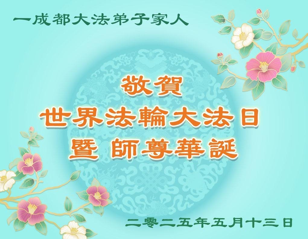恭贺世界法轮大法日! 四川省成都市大法弟子敬上 二零二五年五月十日 四川省成都市大法弟子一家人恭贺世界法轮大法日!