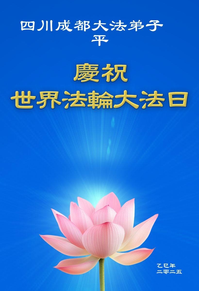 四川省成都市新津区一大法弟子携家属恭贺世界法轮大法日暨敬祝师尊生日快乐!