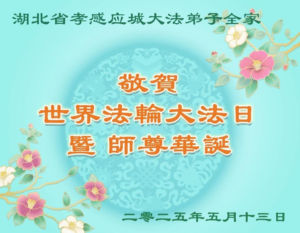 湖北武汉一学法小组大法弟子敬上 湖北省孝感应城大法弟子全家恭贺世界法轮大法日暨师尊华诞!