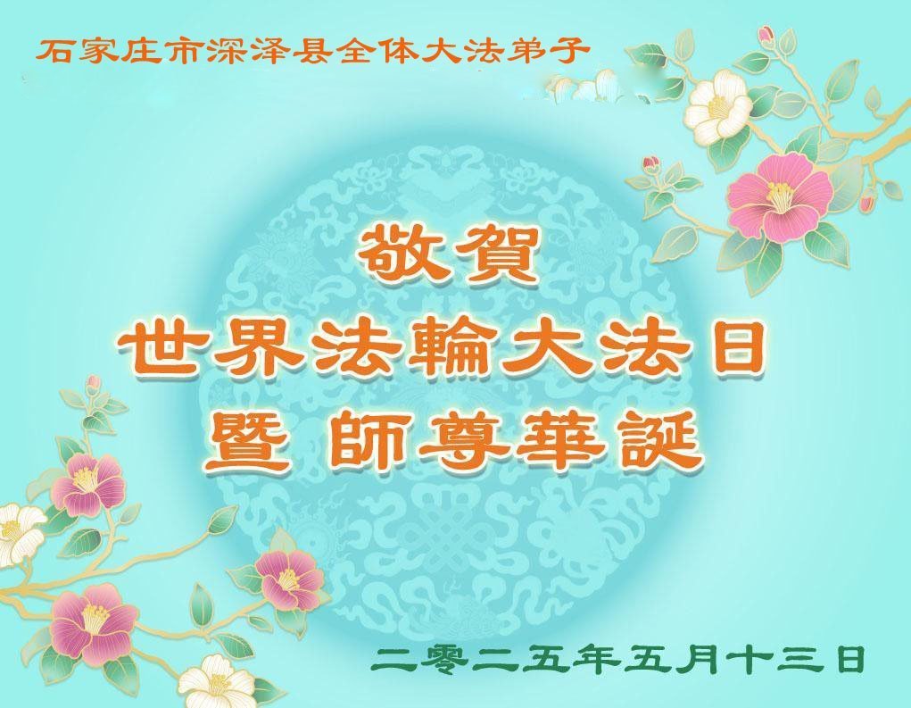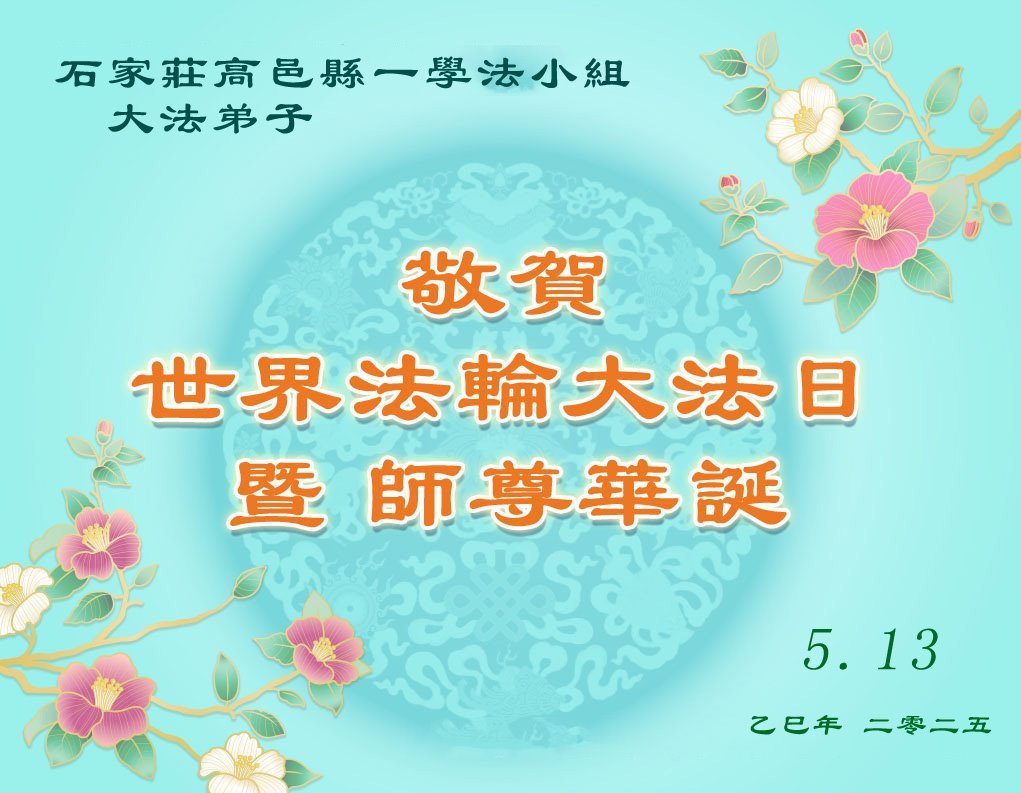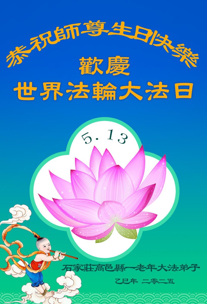 【明慧网二零二五年五月十四日】 河北省石家庄市高邑县一老年大法弟子恭贺师尊华诞暨世界法轮大法日!
