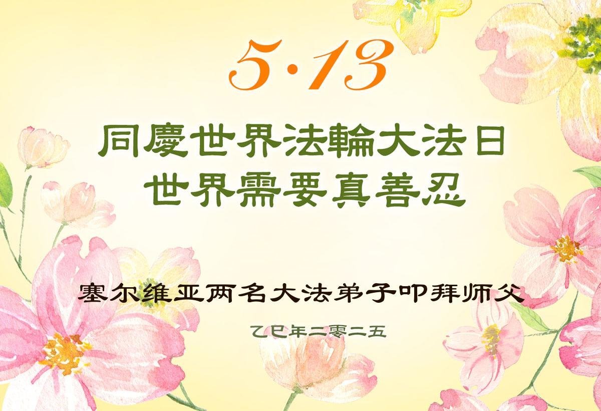 法轮大法洪传三十三载,深刻改变了世界,也使我脱胎换骨。作为大法中的一个小小粒子,在这个普天同庆的日子即将到来之际,内心无数遍的默念:法轮大法好!真善忍好!师父您辛苦了! 塞尔维亚两名大法弟子敬贺世界法轮大法日!