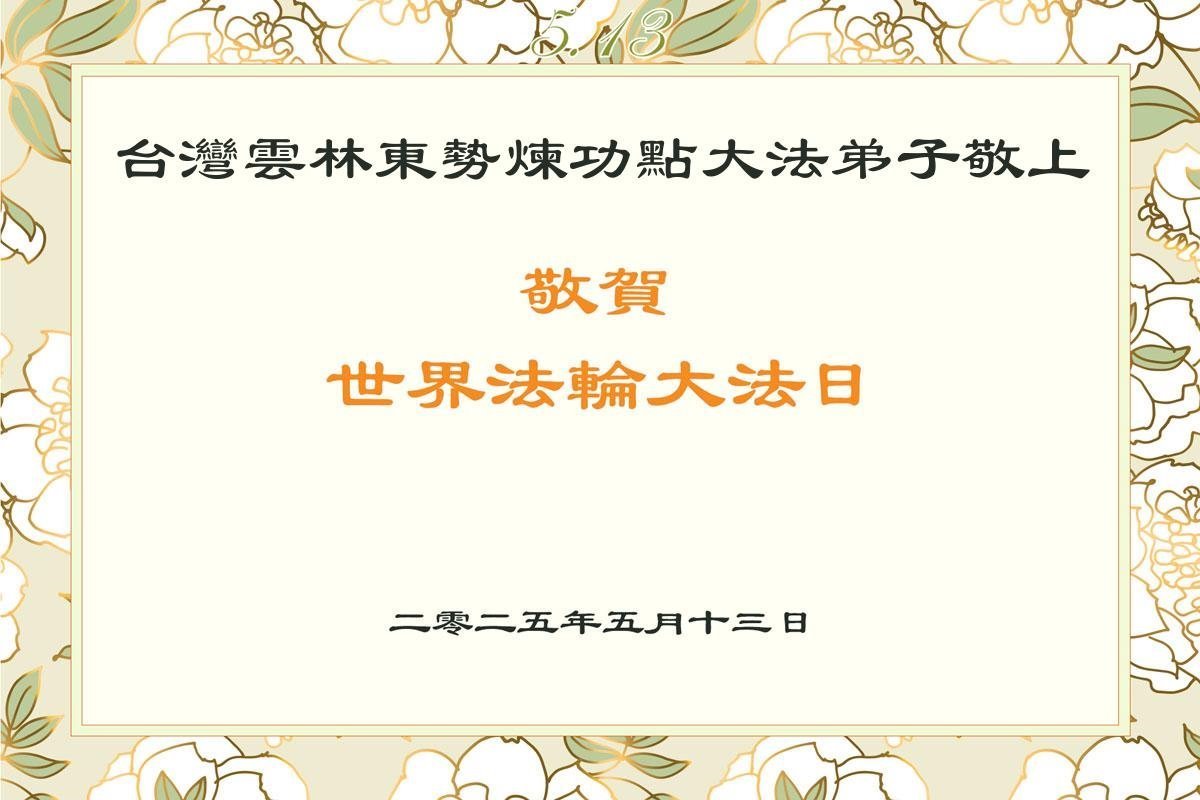 庆祝世界法轮大法日!恭贺法轮大法洪传三十三周年! 台湾云林林内炼功点大法弟子敬上 二零二五年五月十日 台湾云林林内炼功点大法弟子恭祝师尊生日快乐!