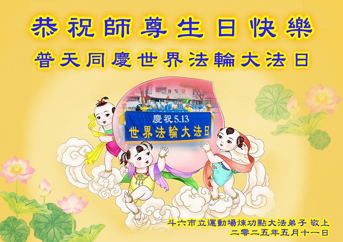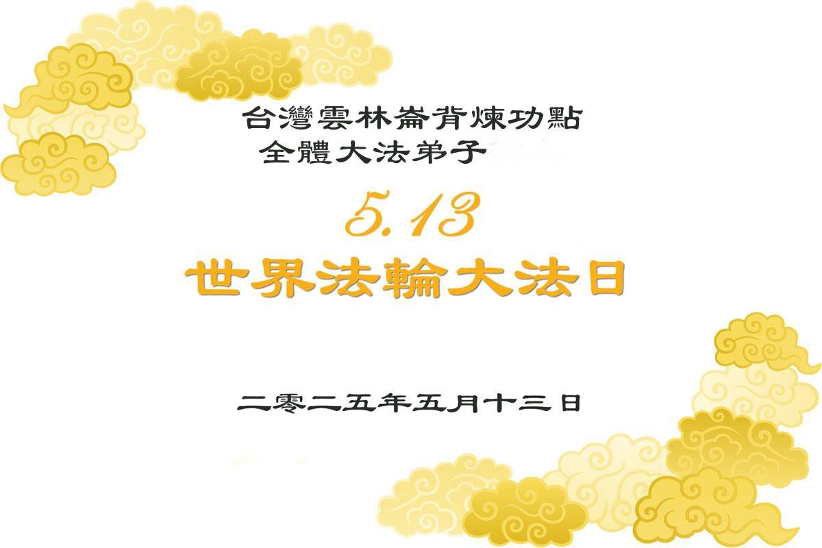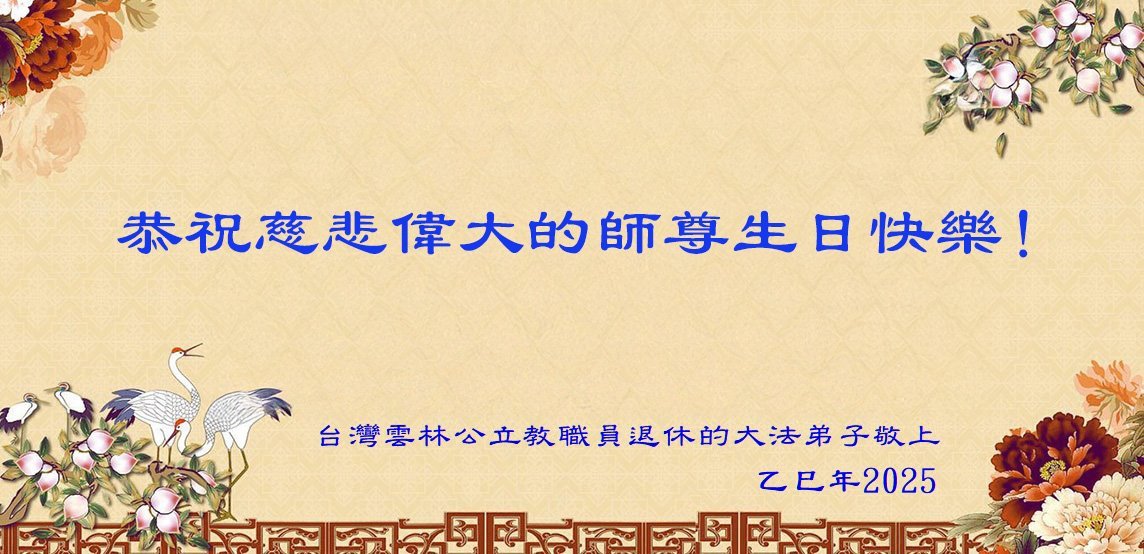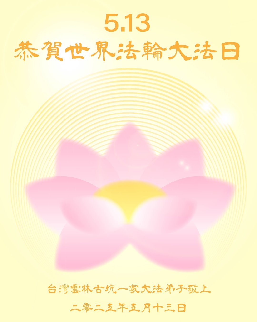 师父 洪大的慈悲 佛恩浩荡 惟愿师父 生日快乐! 弟子愿以无尽无量向上向善之心 同化真善忍大法 回归生命之本源 台湾云林一炼功点大法弟子敬上 二零二五年五月九日 台湾云林一炼功点全体大法弟子恭祝慈悲伟大的师尊华诞!