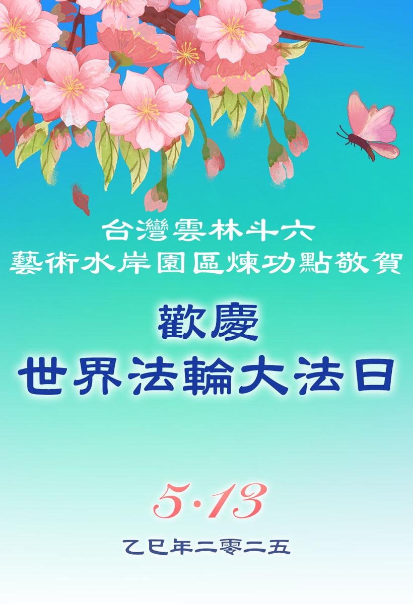 二零二五年五月九日 台湾云林斗六艺术水岸区炼功点大法弟子恭贺法轮大法洪传世界33周年!