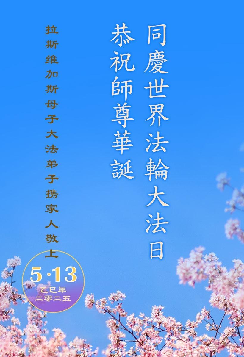 拉斯维加斯母子大法弟子携家人恭祝慈悲伟大的师尊生日快乐!同庆世界法轮大法日!