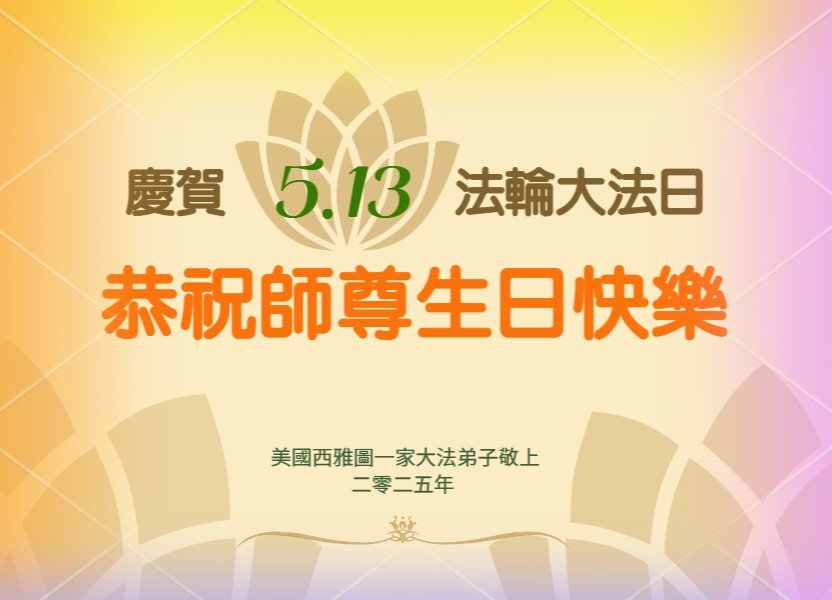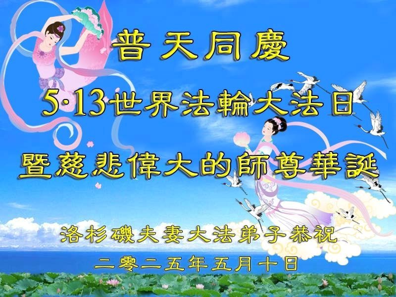 恭祝师尊华诞暨世界法轮大法日! 美国大洛杉矶地区一大法弟子敬上 二零二五年五月十一日 美国洛杉矶新!唐!人:大.纪.元;全体大法弟子恭祝慈悲伟大师父生日快乐!恭贺世界法轮大法日!