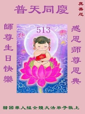 恭贺世界法轮大法日!恭祝师尊生日快乐!感恩师尊恩典!真善忍好! 韩国华人组大法弟子敬上 韩国大法弟子恭贺世界法轮大法日!恭祝师尊生日快乐!