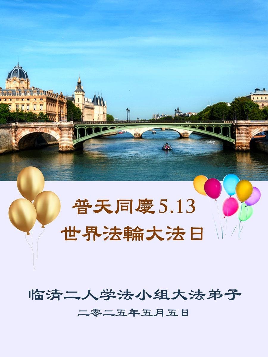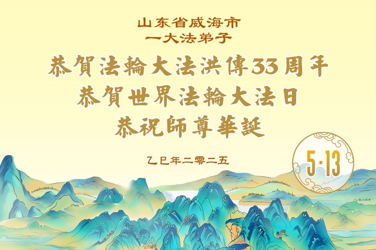 【明慧网二零二五年五月十五日】 山东省威海市一大法弟子恭贺法轮大法洪传33周年暨恭祝师尊华诞!