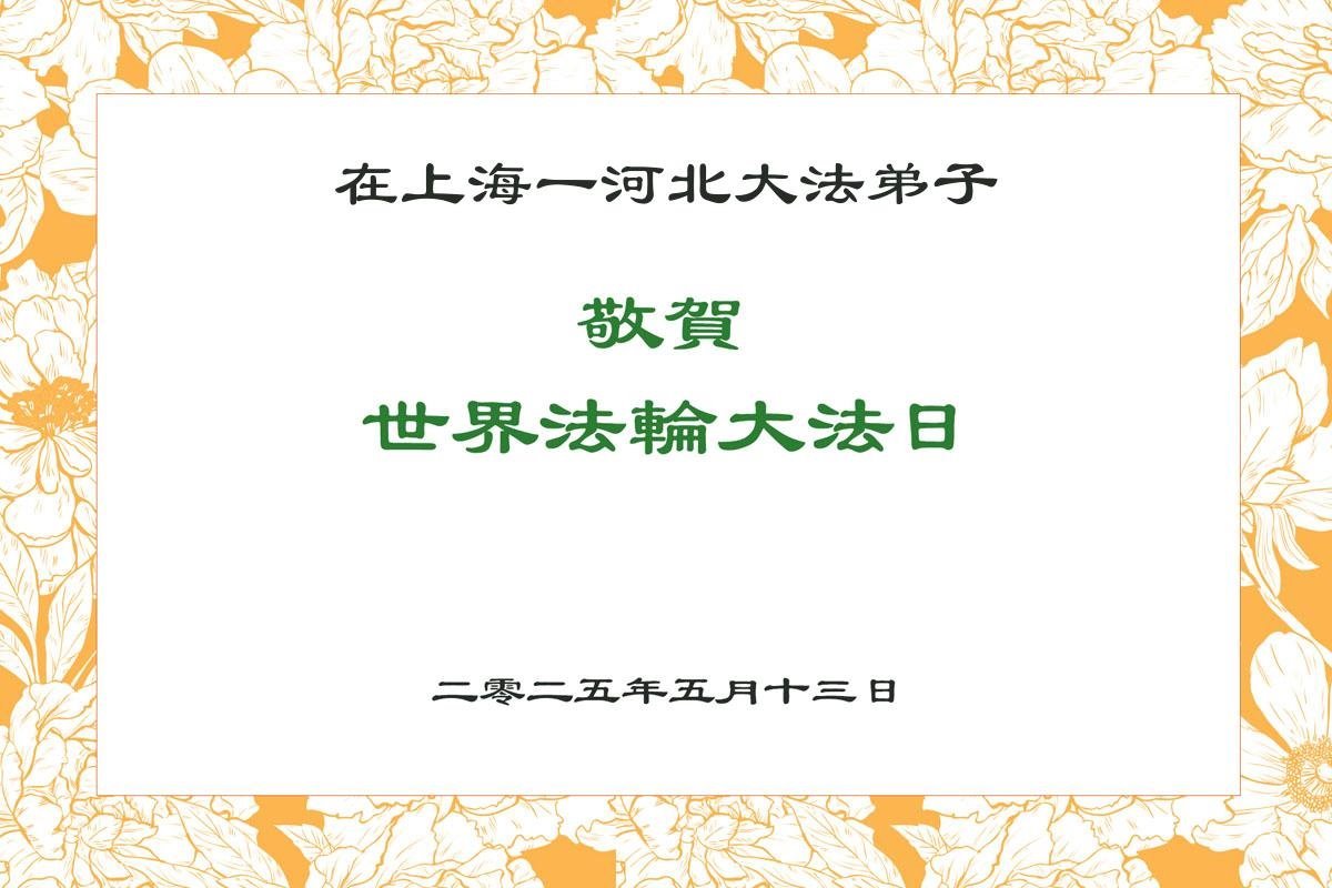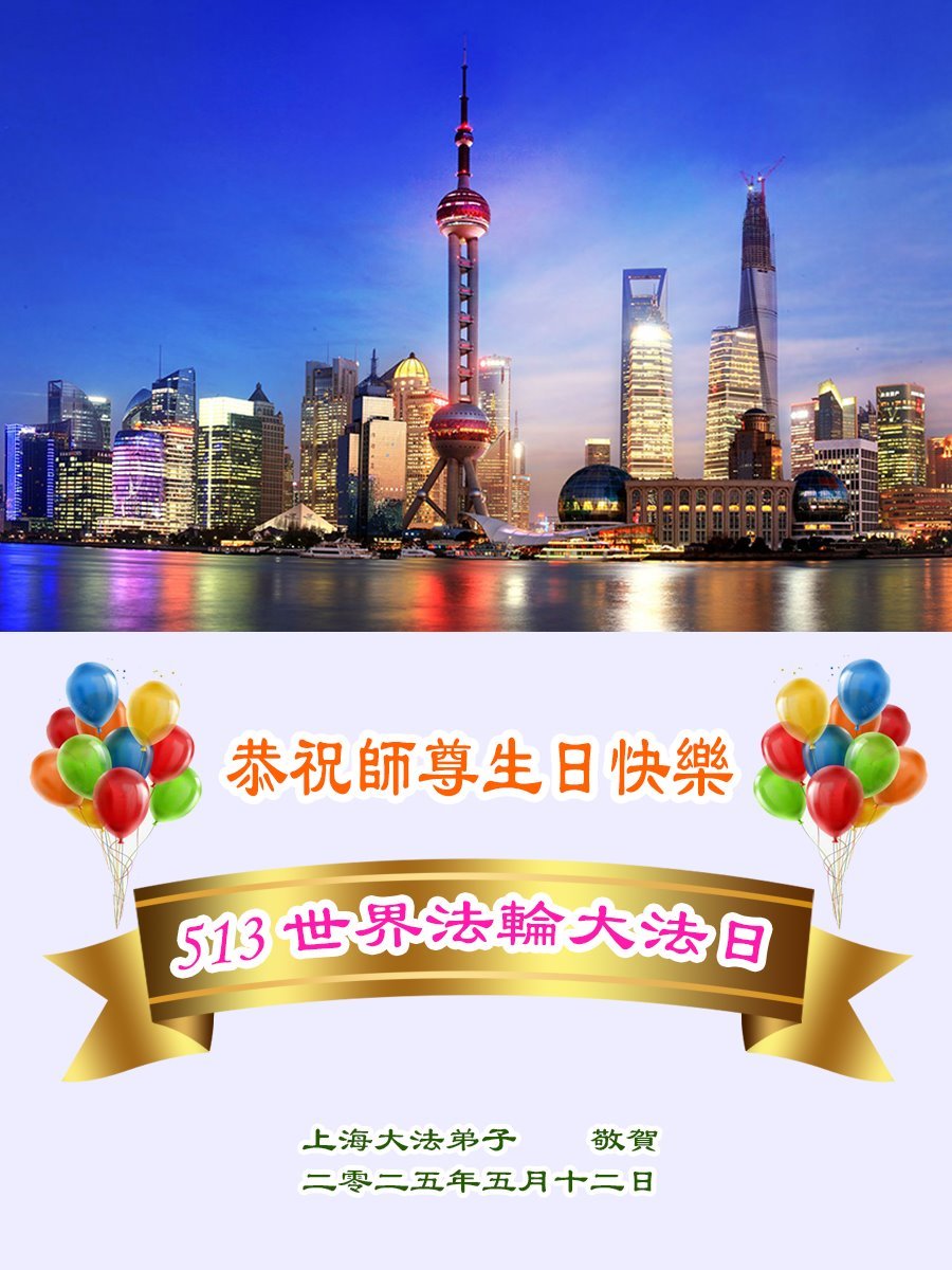 普天同庆世界法轮大法日!弟子牢记师尊教诲,精進实修,兑现誓约,跟师父回家。 在上海打工的山东大法弟子敬上 二零二五年五月九日 上海市一大法弟子恭贺世界法轮大法日暨师尊华诞!