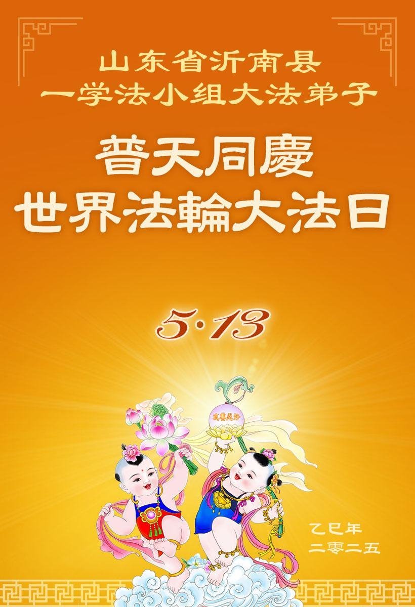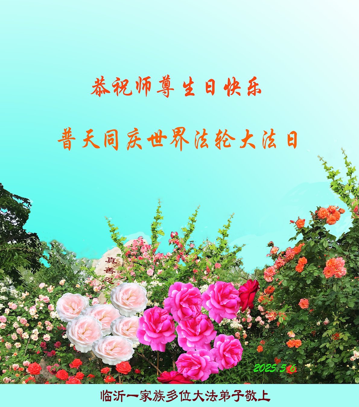 庆祝世界法轮大法日! 山东省沂南县一学法组大法弟子敬上 二零二五年五月十日 山东省临沂沂水大法弟子及家人恭贺世界法轮大法日!恭祝师尊华诞!