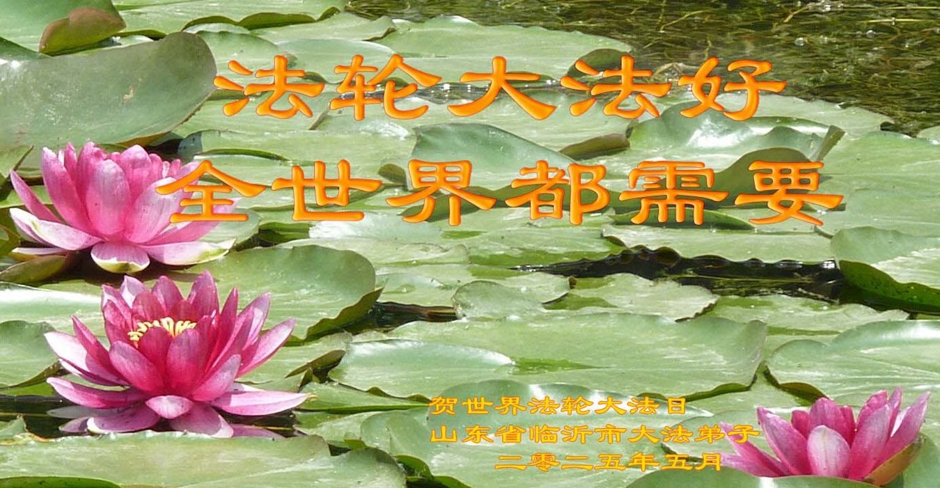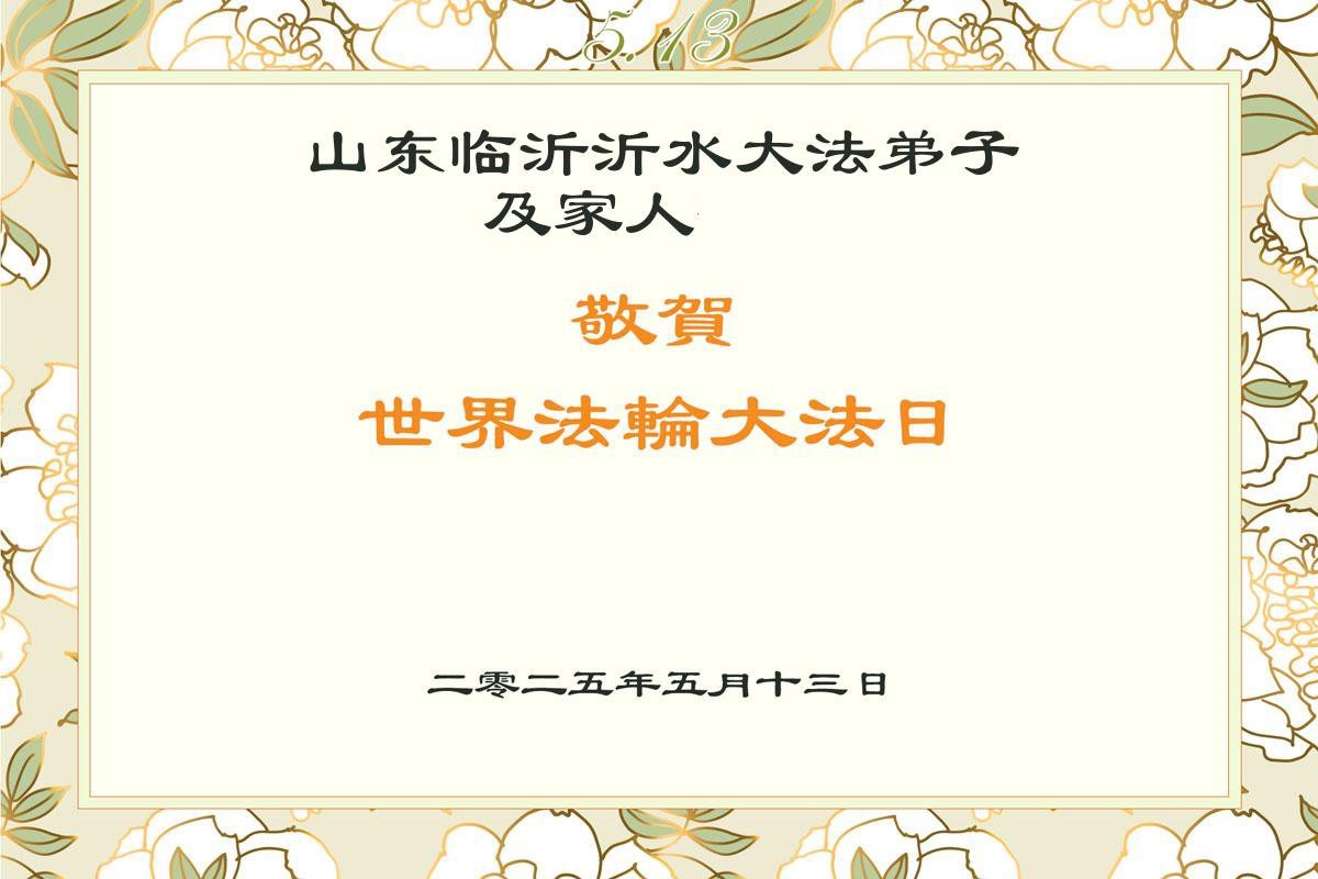 值此法轮大法洪传三十三周年之际,我们和全世界大法弟子一起同庆世界法轮大法日!恭祝慈悲伟大的师父生日快乐!感谢师父将宇宙大法传于世间,救度无量众生于危难之际,我们大法弟子每一步的升华与提高,都离不开师父的指引、加持与保护,弟子一定会努力做好三件事,去除一切执著,用正念看待问题,兑现誓约,不辜负师父的慈悲救度! 山东省临沂市一家四口大法弟子敬上 二零二五年五月九日 山东省临沂市大法弟子祝贺世界法轮大法日!