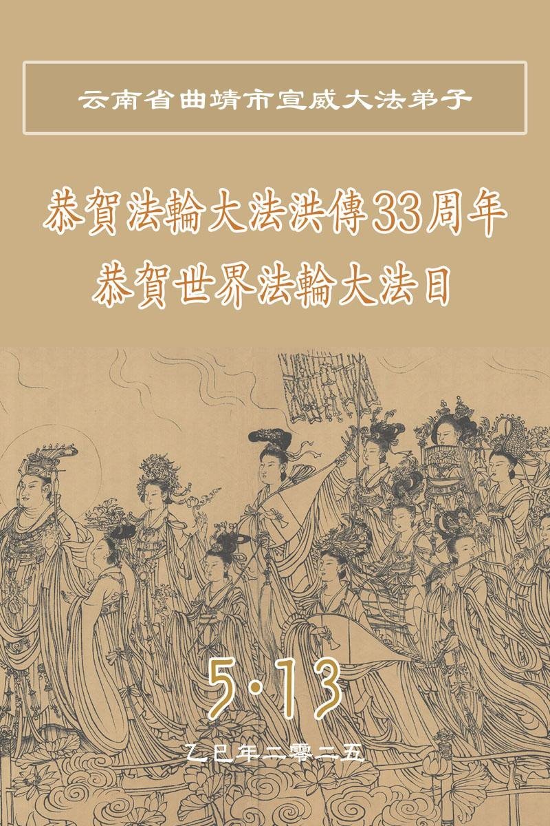 恭贺法轮大法洪传33周年!恭贺世界法轮大法日!恭祝慈悲伟大的师尊生日快乐! 云南省昆明市一学法小组大法弟子敬上 二零二五年五月十一日 云南省昆明市北市区一学法小组大法弟子恭贺世界法轮大法日暨师尊华诞!