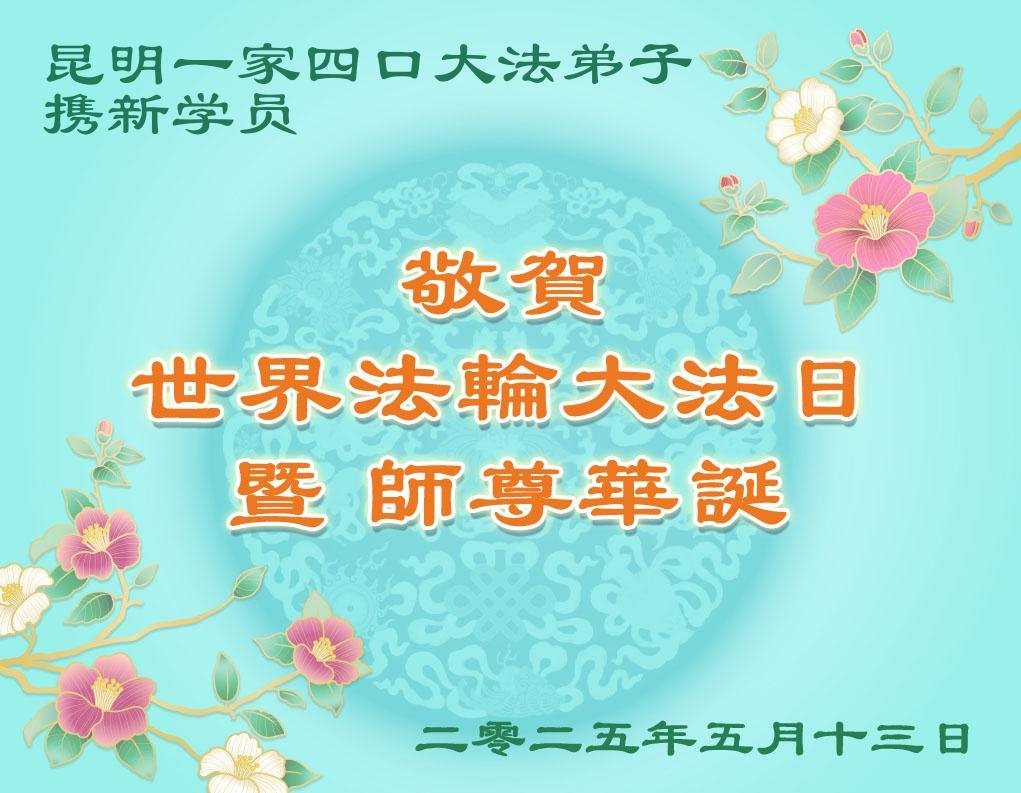 恭贺法轮大法洪传33周年!恭贺世界法轮大法日!恭祝慈悲伟大的师尊生日快乐! 云南个旧大法弟子敬上 二零二五年五月十一日 云南省昆明一家四口大法弟子携刚修炼的大法弟子恭贺世界法轮大法日暨师尊华诞!