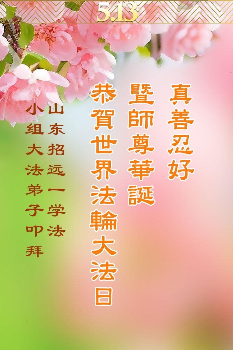 师父您好,您辛苦了!在这明媚的春光里我们迎来了普天同庆、同贺殊胜而伟大的节日——五·一三世界法轮大法日!世界法轮大法日是全人类的伟大节日,也是全世界大法弟子和善良民众共同欢庆的日子。我们在欢庆的日子里,牢记我们的使命——救度众生。让师父多一份欣慰,少一份操劳。 山东开发区一青年学法小组大法弟子恭祝师尊生日快乐!