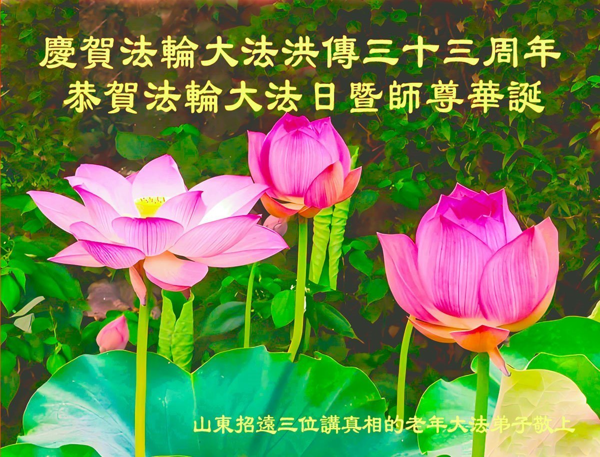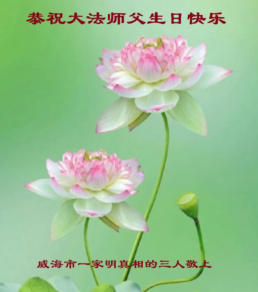 庆贺世界法轮大法日!恭祝大法师父生日快乐! 山东省威海市二名大法弟子敬上 山东烟台市龙口市母女2名大法弟子及未修炼的家人恭贺世界法轮大法日暨师尊生日快乐!