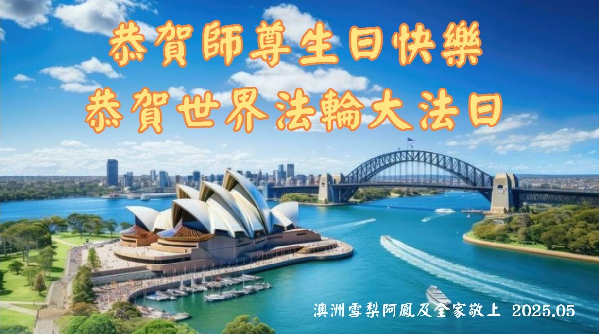 【明慧网二零二五年五月十五日】 澳洲悉尼市大法弟子恭祝师尊华诞!恭贺世界法轮大法日!恭贺法轮大法洪传33周年!