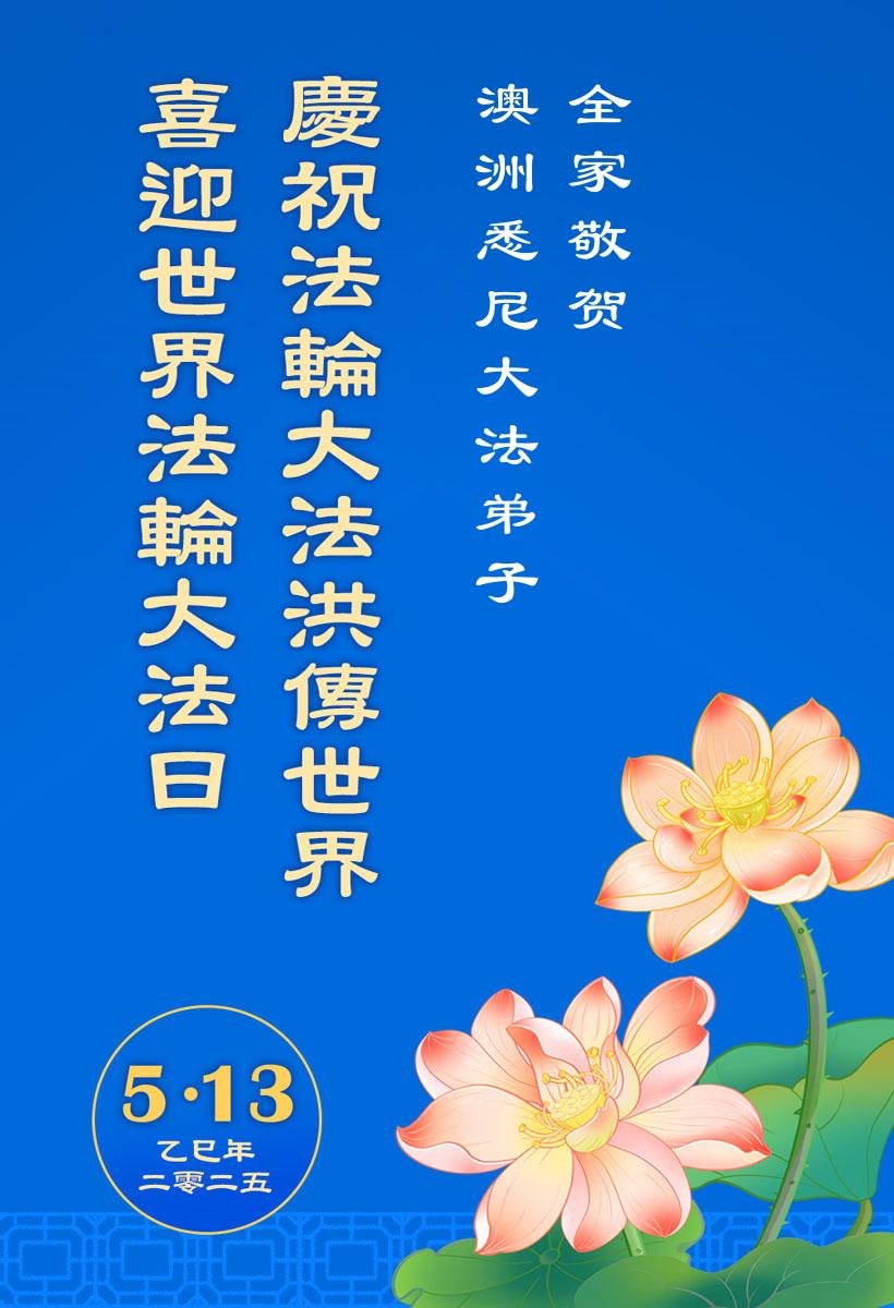 在全宇普天同庆、同祝和同颂世界法轮大法日之际,我们以最虔诚、感恩和纯净的心: 恭祝慈悲伟大的师尊生日快乐! 恭贺世界法轮大法日! 澳大利亚悉尼一大法弟子全家七人敬贺 二零二五年五月十三日 澳洲大法弟子恭贺世界法轮大法日暨师尊华诞!