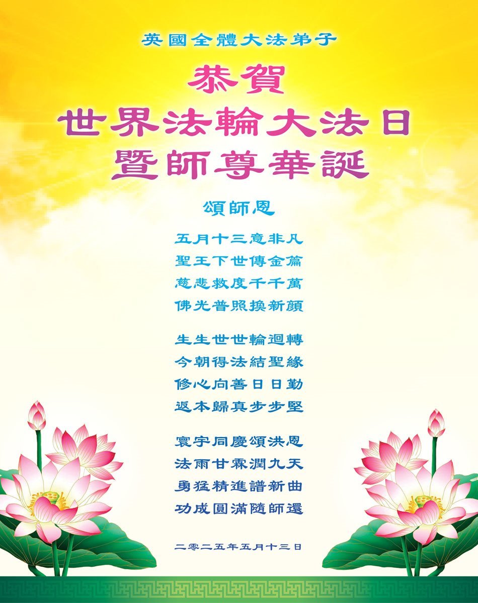 法国全体大法弟子敬上 英国全体大法弟子恭贺世界法轮大法日暨师尊华诞!