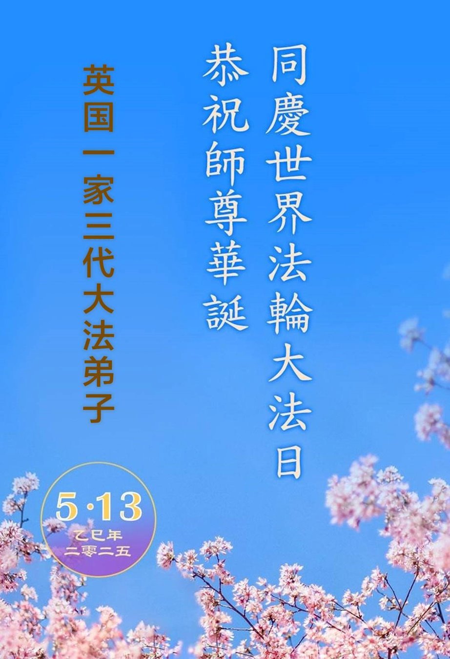 祝师尊生日快乐! 英国布莱顿豪富市大法弟子 二零二五年五月十三日 英国大法小弟子恭祝师父生日快乐!