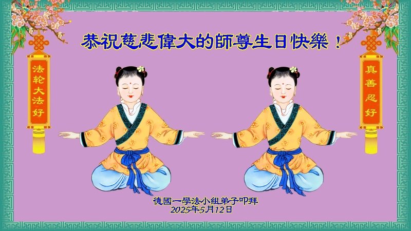 瑞士法轮大法弟子感恩师尊将大法传于世间,让我们能有机会成为大法弟子,遵循真善忍去生活。弟子愿让更多人听闻大法,知晓大法及真善忍的美好。恭祝师尊华诞!瑞士大法弟子敬上 二零二五年五月 德国一学法小组大法弟子恭祝慈悲伟大的师尊生日快乐!