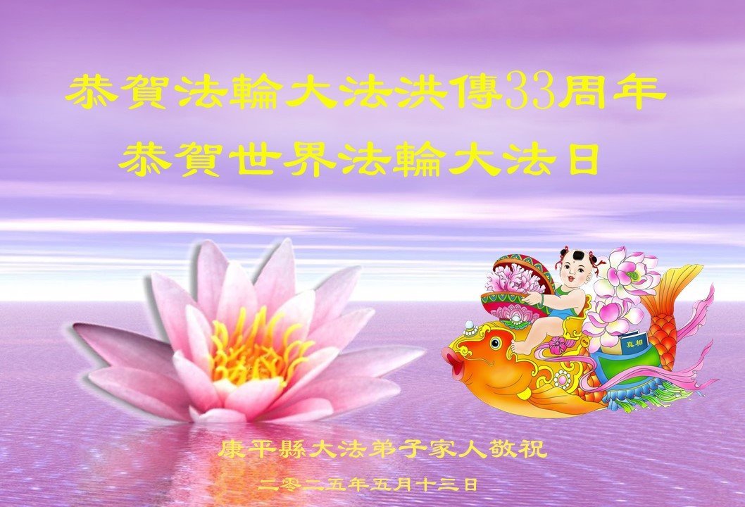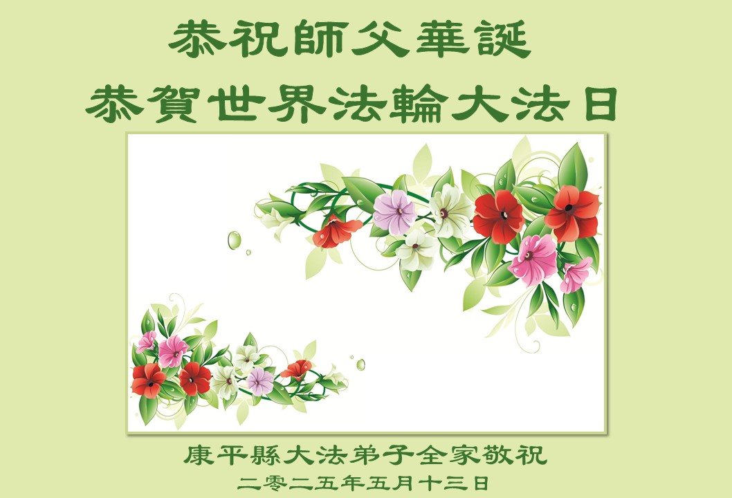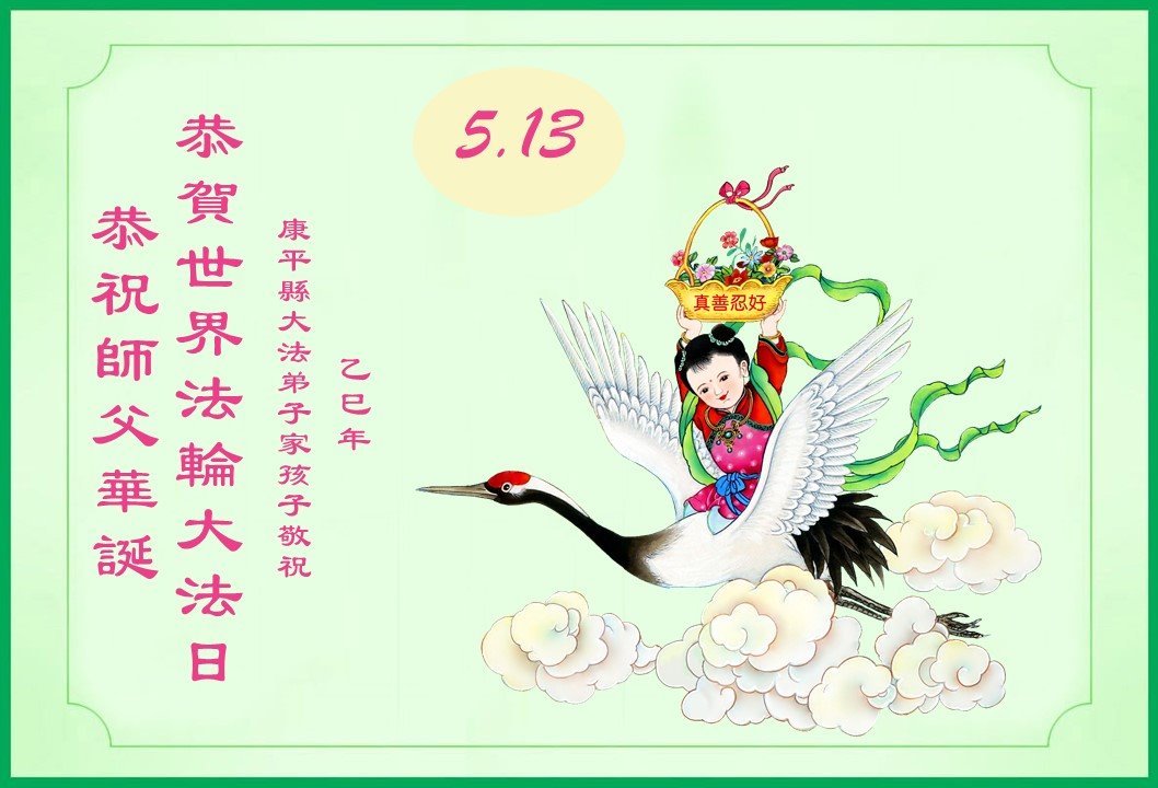 恭祝慈悲伟大的师尊生日快乐!恭贺五·一三世界法轮大法日!师尊您辛苦了!弟子怀着一颗感恩的心,用尽人类的语言也无法表达对师尊的感恩!您为救度众生吃尽了人间苦,遭了无数的罪,为真修弟子承受了巨难,圣恩难报!无以为报! 请洪恩浩荡的伟大师尊放心:弟子会把您的慈悲苦度铭刻在心。牢记师尊的严肃教诲“大家都心往一处想,都以法伟大,都以修炼人自律,都以救人项目不受损害,走过难关才是修炼人该有的表现。”我就听师父的话,就按法的要求去做,学好法,修好自己,多救人。坚定的走在师尊指引的这条助师正法的金光大道上,完成使命,跟师尊回到久别的美好家园。惟愿师尊笑!叩拜师尊!感恩!感恩!再感恩! 辽宁省沈阳市老年夫妻大法弟子及女儿全家敬上 辽宁省沈阳市一讲真相小组大法弟子恭贺法轮大法日!