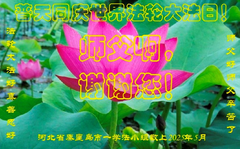 庆贺世界法轮大法日,恭祝慈悲伟大的师父生辰快乐! 感谢师父对我一家的慈悲保护!师父辛苦了! 河北省秦皇岛市一母女大法弟子敬上 二零二五年五月十一日 河北省秦皇岛市大法弟子恭祝世界法轮大法日!恭祝师父生日快乐!