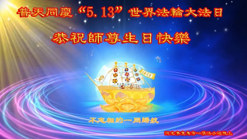 普天同庆“5.13”世界法轮大法日! 恭祝师尊生日快乐! 感恩师尊慈悲苦度! 真善忍好 法轮大法好! 叩拜师尊 谢谢师父! 我们学法小组全体成员,同心协力发好正念,维护好大法,做好三件事,紧跟师父回家。 河北秦皇岛市一学法小组敬上 2025年5月12日 河北省秦皇岛一家老年夫妻恭祝慈悲伟大的师尊生日快乐!
