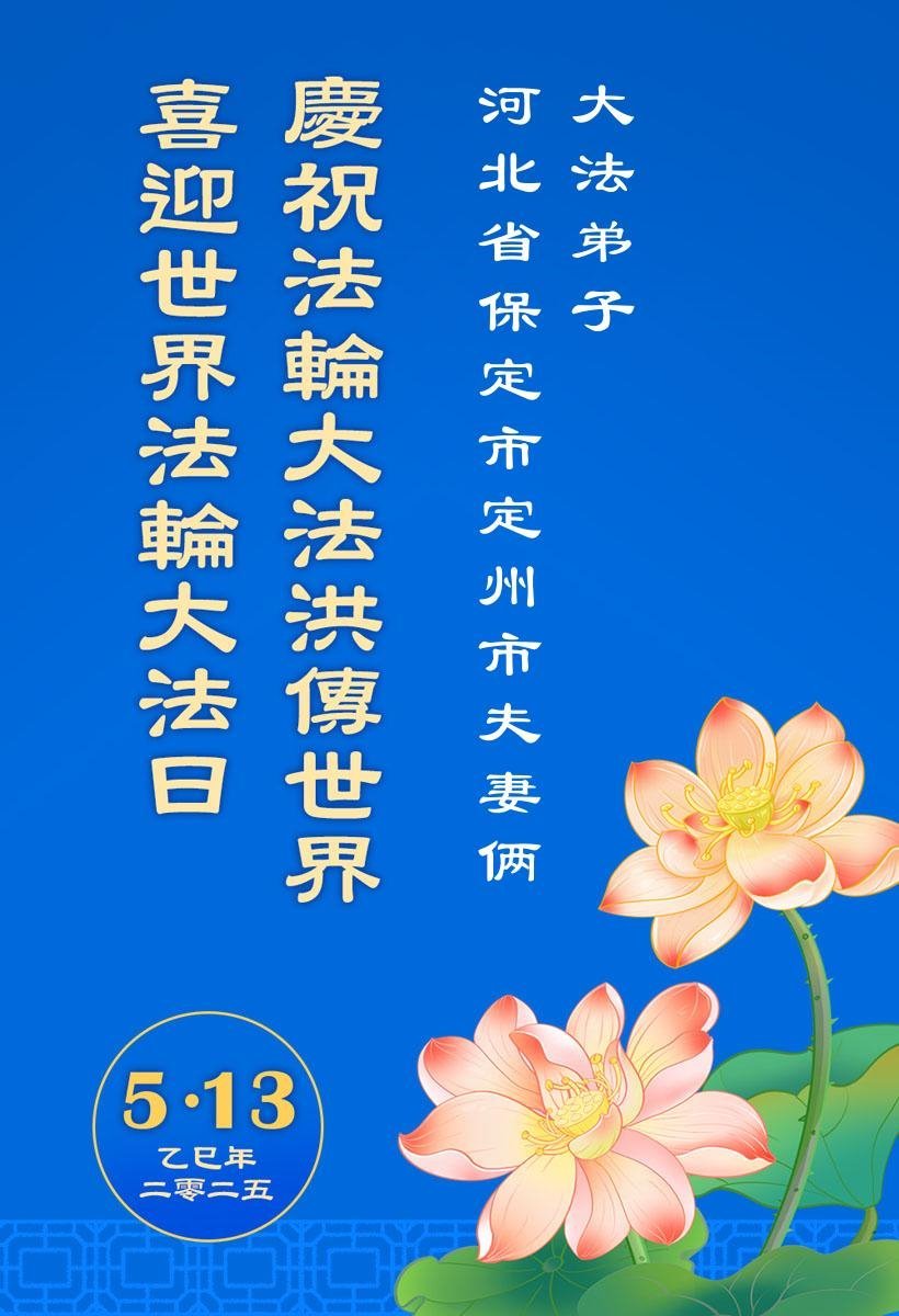 河北省保定市定州市夫妻俩大法弟子恭贺世界法轮大法日!