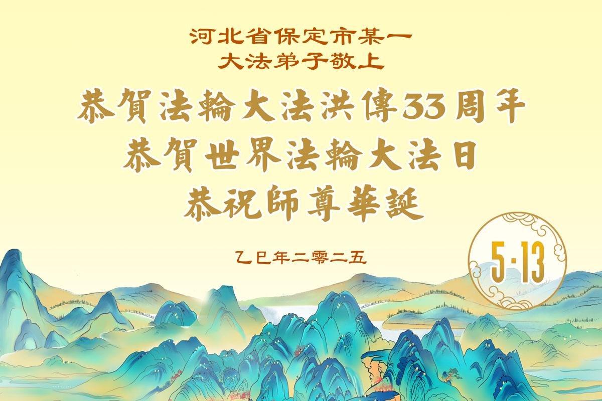 在这普天同庆的日子里,恭祝师尊生日快乐!弟子唯有做好三件事以报师恩。 河北省保定市大法弟子恭贺世界法轮大法日!恭祝慈悲伟大的师尊生日快乐!