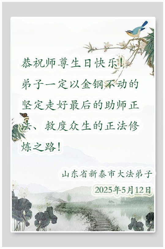 修炼十数载,悄然已道中,定当勇猛精進,随师回家。恭贺世界法轮大法日,恭祝师尊华诞! 山东省淄博市大法弟子敬上 二零二五年五月十二日 山东省烟台市龙口市大法弟子恭祝师父生日快乐!