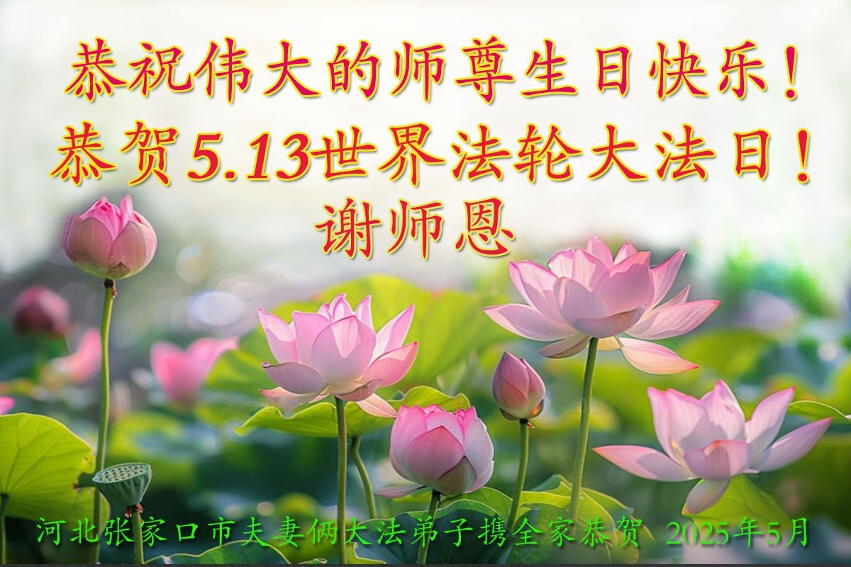 在今后不多的时间里,弟子要多学法,精進实修,去掉各种人心,做好三件事,让师尊少一些操劳,多一些欣慰! 张家口二大法弟子五口敬上 二零二五年五月十二日 河北省张家口市一对夫妻大法弟子及儿子儿媳恭祝师尊华诞暨世界法轮大法日!