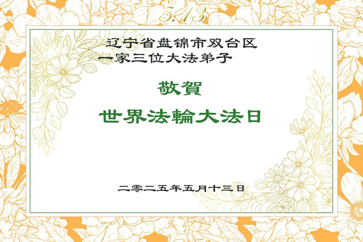 盘锦一学法小组大法弟子 二零二五年五月十二日 辽宁盘锦市一家三位大法弟子恭贺世界法轮大法日!恭祝师父生日快乐!