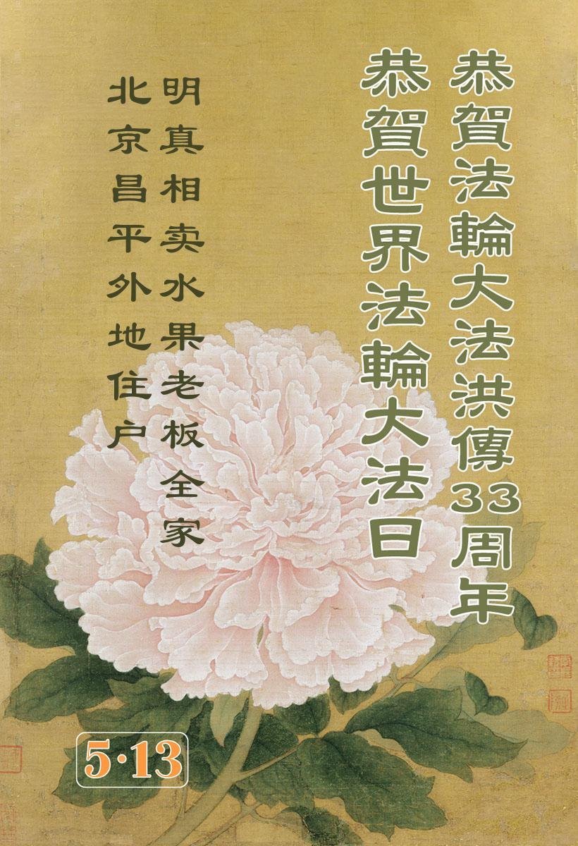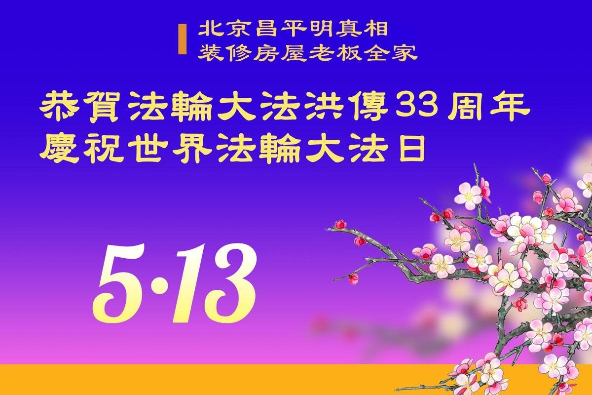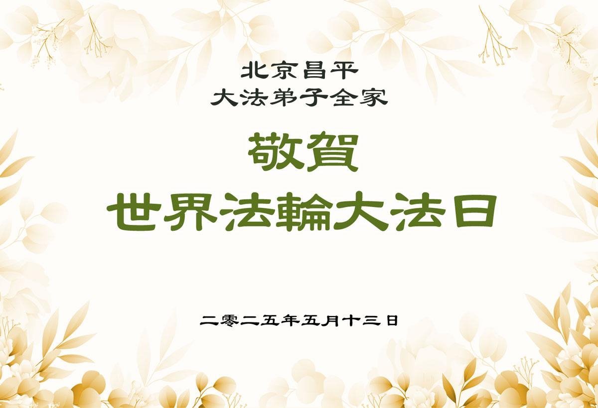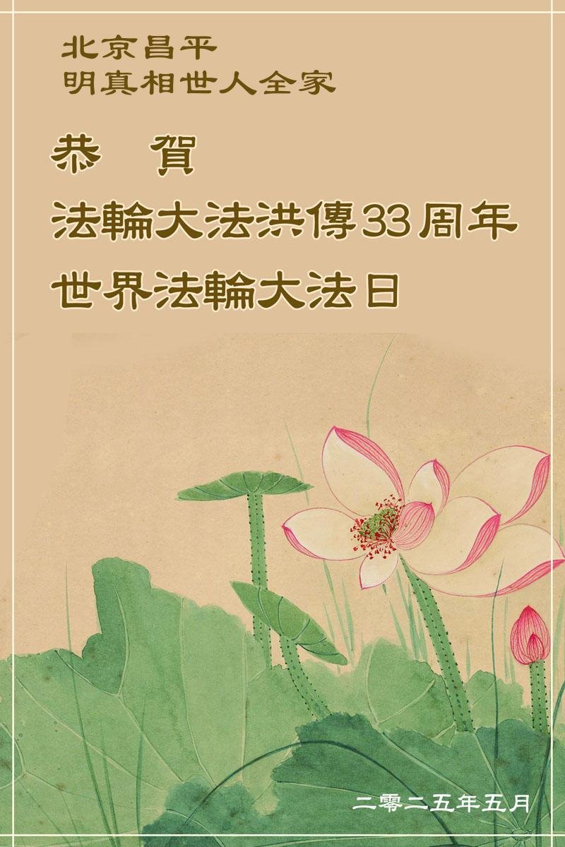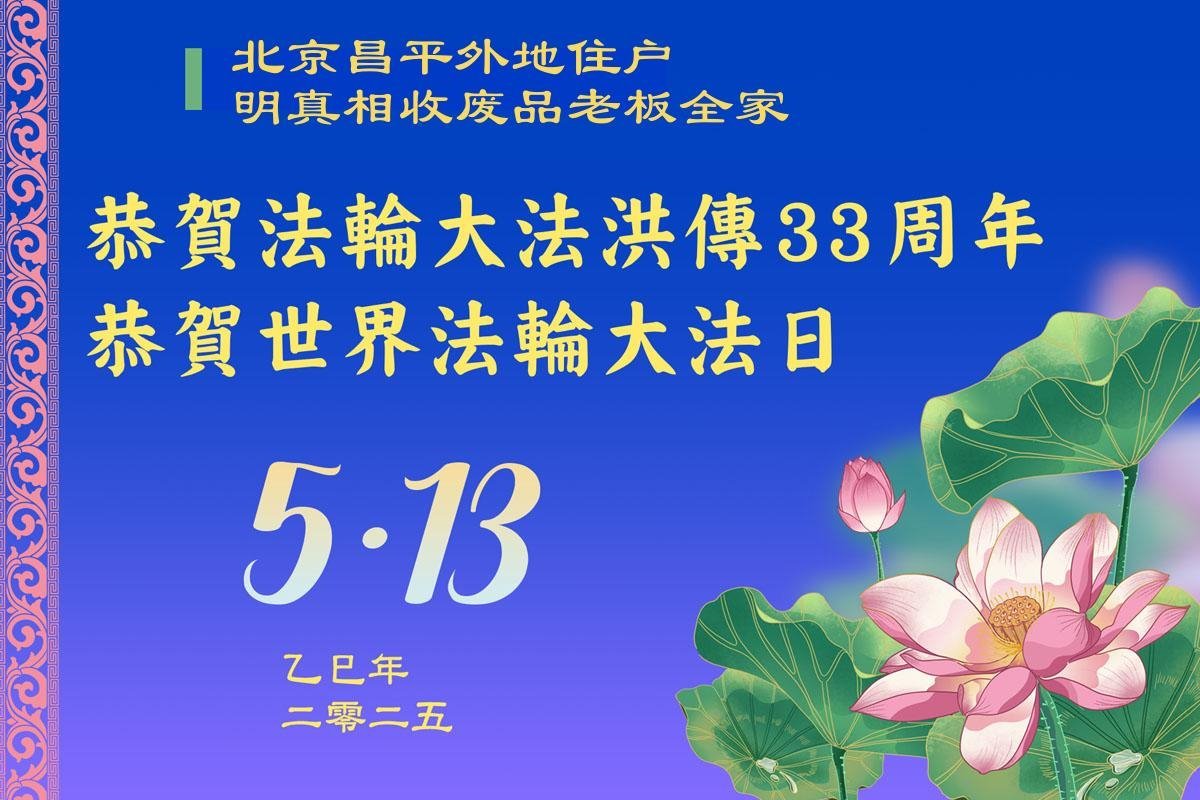 北京大法弟子及全家4口人,恭祝慈悲伟大的师尊生日快乐! 恭贺法轮大法洪传33周年!恭贺世界法轮大法日! 北京大法弟子 二零二五年五月十三日 北京昌平外地住户明真相卖水果老板全家恭祝李大师生日快乐!