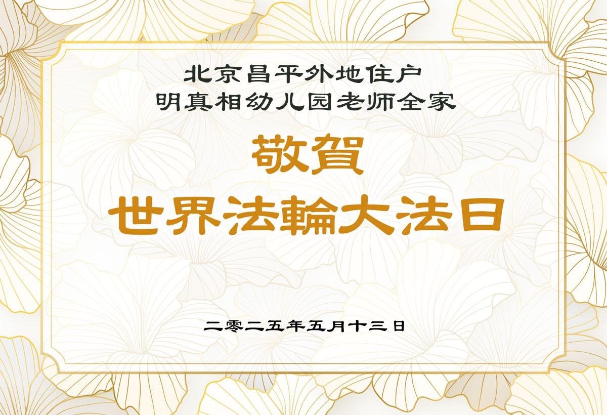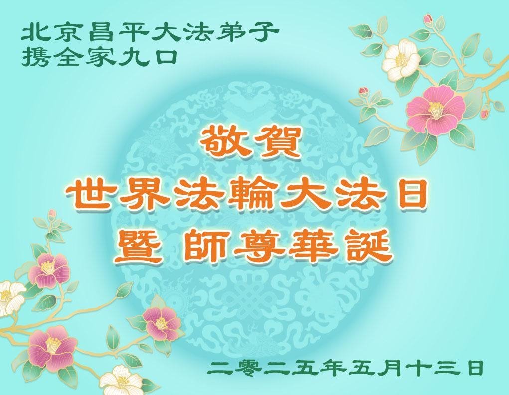 北京昌平外地住户明真相幼儿园王老师全家4口恭祝李洪志大师生日快乐! 二零二五年五月十三日 北京昌平明真相众生全家11口人恭祝李大师生日快乐!