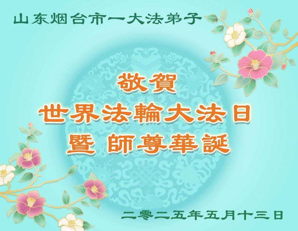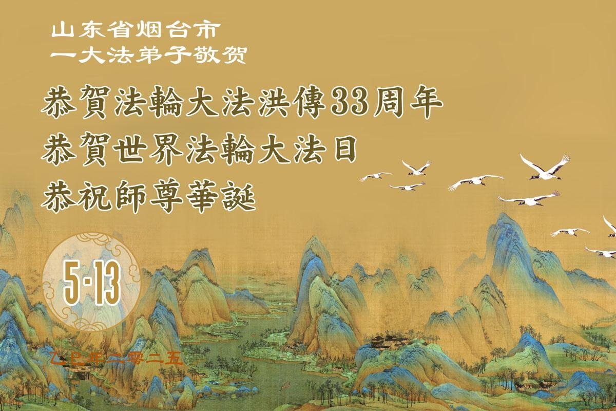 弟子遥祝慈悲伟大的师尊生日快乐!同祝、同贺、同庆世界法轮大法日暨法轮大法洪传33周年! 弟子一定好好学法,精進实修,多发正念,跟上师父的正法進程,做好大法弟子该做的,圆容好师父所要的,助师正法救人,兑现誓约! 弟子跪拜 山东省教育系统的大法弟子 二零二五年五月十三日 山东省烟台市大法弟子庆祝法轮大法日!
